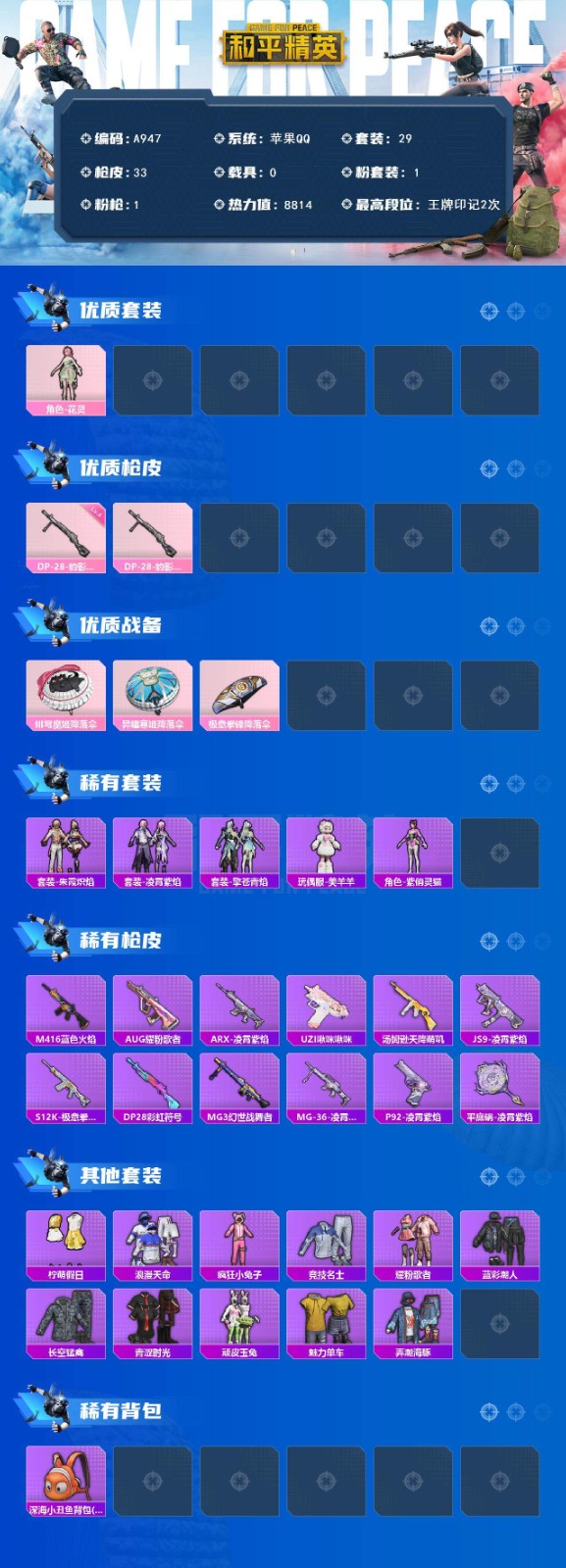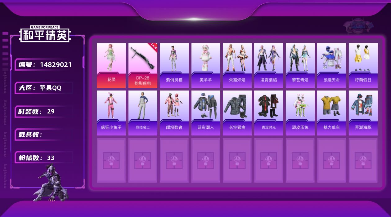 苹果 【小号 角色-花灵】手Q-1粉装-1特效枪-0载具-0粉色飞行器-8814热力值-2王牌印记-29套装-33枪皮 【热门品类】:套装-浪漫天命 【粉色套装】:角色-花灵 【粉色枪皮等级】:DP-28-豹影疾电(四级) 【粉色枪皮】:DP-28-豹影疾电 【粉色降落伞】:绯穹魔姬降落伞,异瞳寒姬降落伞,极意拳锋降落伞 【稀有套装】:套装-朱霞炽焰,套装-凌霄紫焰,套装-擎苍青焰,玩偶服-美羊羊,角色-紫俏灵猫 【稀有枪皮】:M416-蓝色火焰,AUG-耀粉歌者,ARX-凌霄紫焰,UZI-啾咪啾咪,汤姆逊-天降萌叽,JS9-凌霄紫焰,S12K-极意拳锋,DP-28-彩虹符号,MG3-幻世战舞者,MG-36-凌霄紫焰,P92-凌霄紫焰,平底锅-凌霄紫焰 【其他套装】:套装-柠萌假日,套装-浪漫天命,套装-疯狂小兔子,套装-竞技名士,套装-耀粉歌者,套装-蓝彩潮人,套装-长空猛禽,套装-青涩时光,套装-顽皮玉兔,套装-魅力单车,套装-弄潮海豚 【稀有背包】:深海小丑鱼背包(1级) 【营地ID】:1018572966