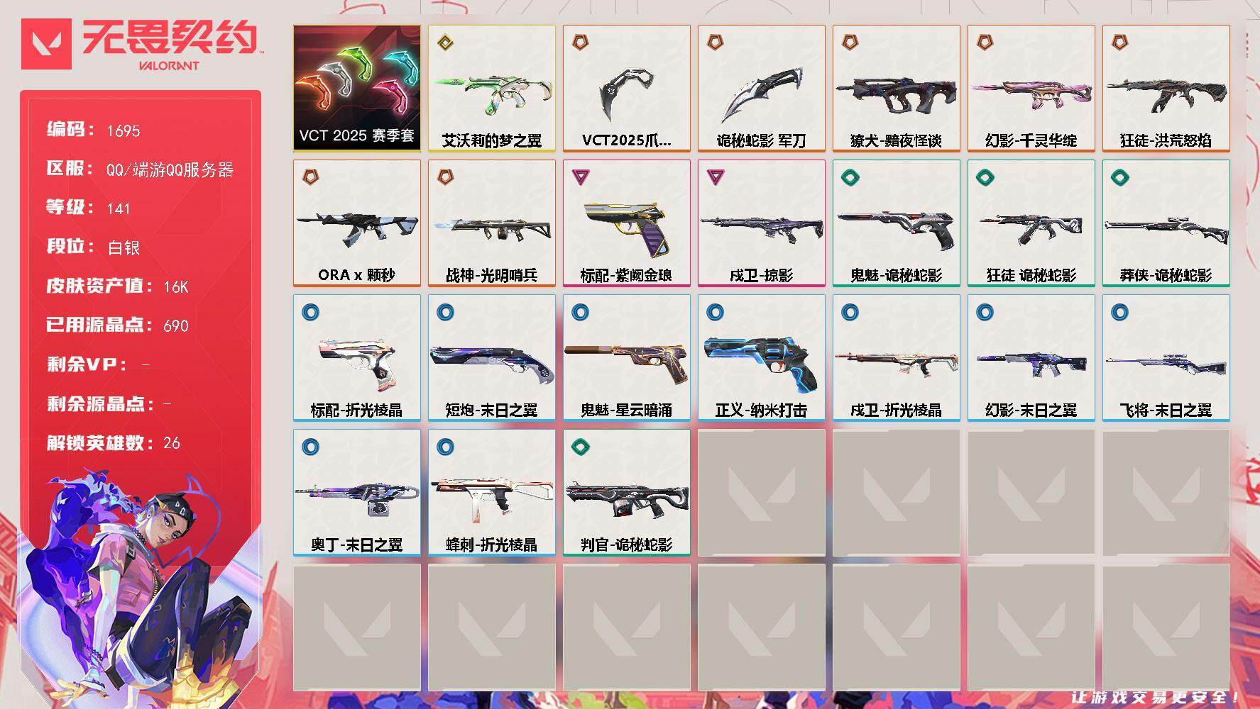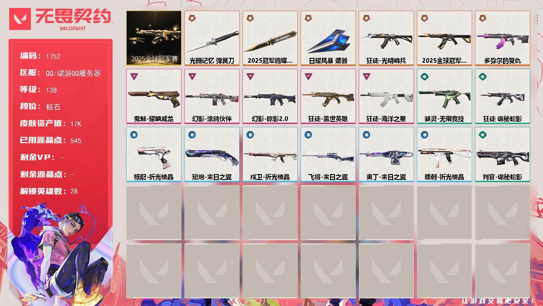 6橙皮 5紫皮 34皮肤 17080皮肤总价值 545已用源晶 钻石
