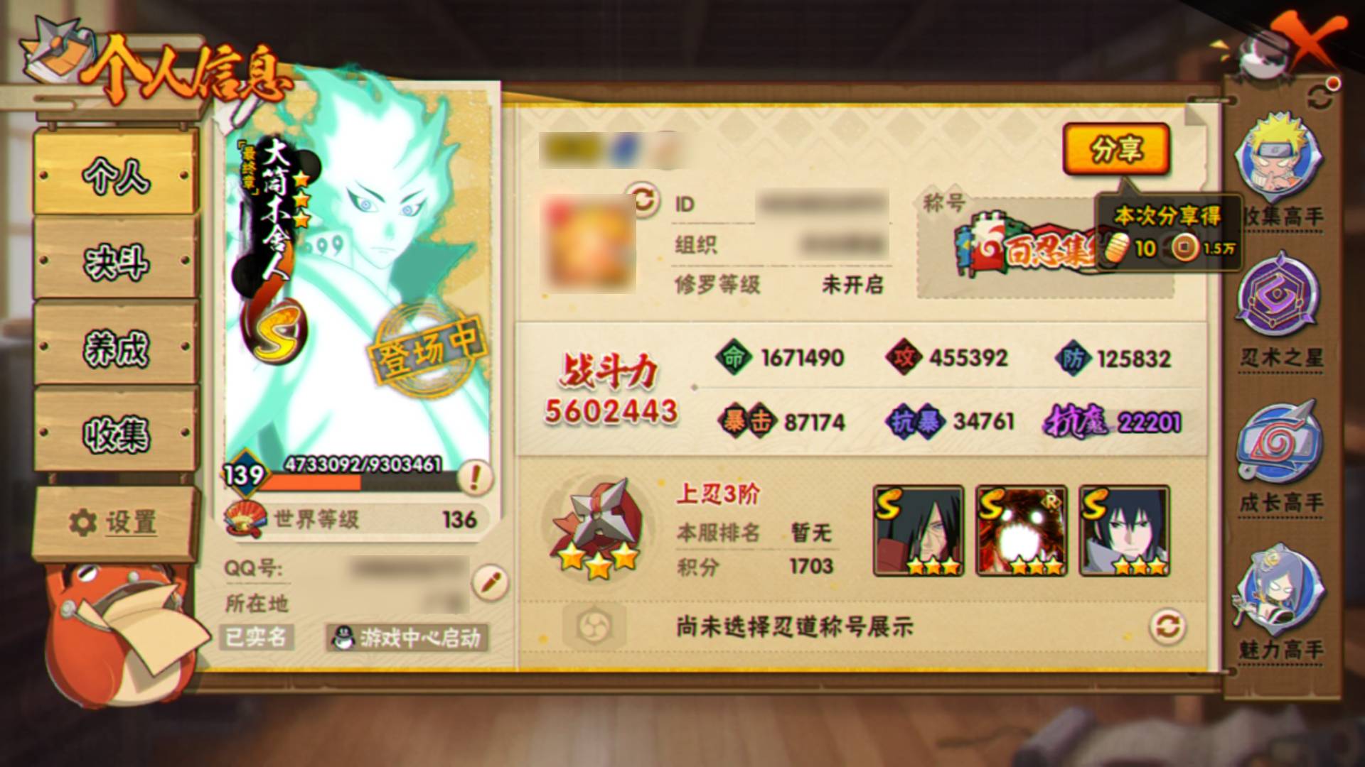 V11 32S忍 52A忍 258忍 3954S碎片 19通灵 1000W战力 前500名