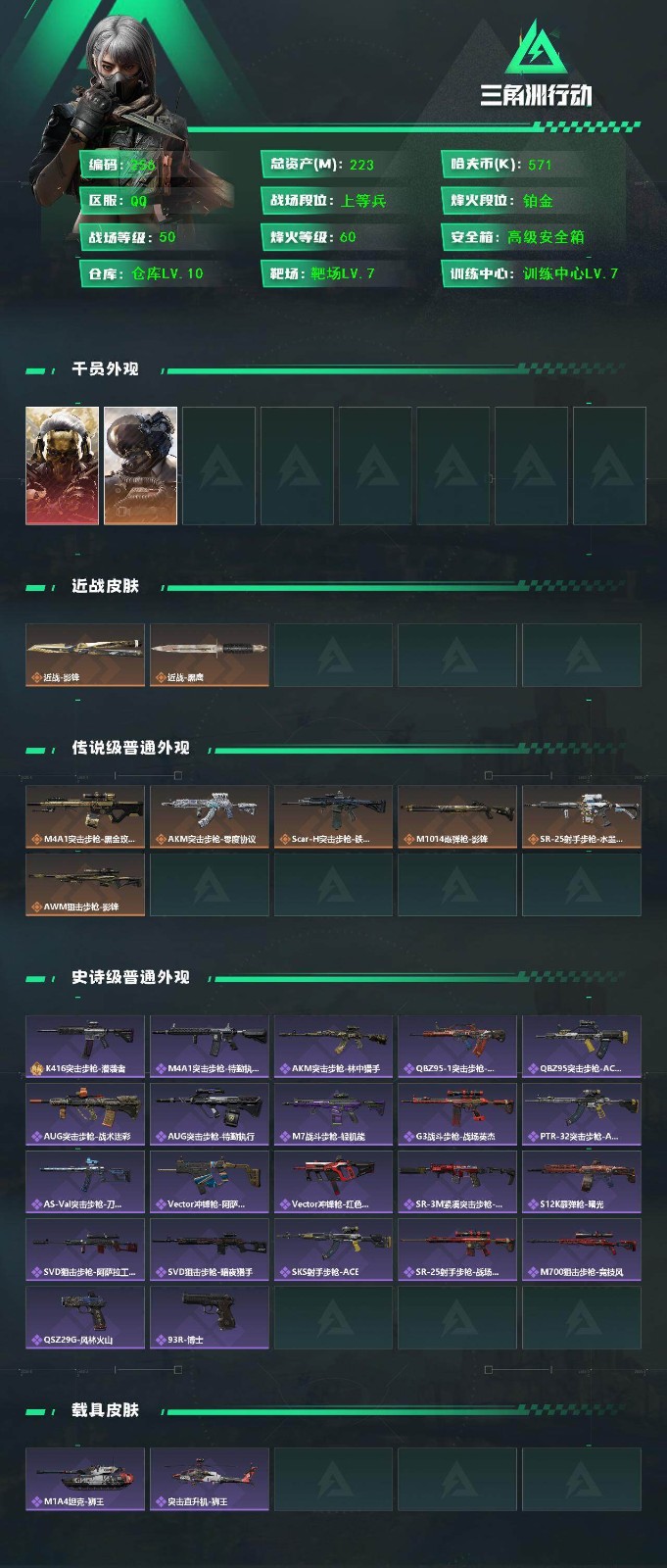 总资产55M 11干员外观 1传说近战 32传说枪械 黑鹰