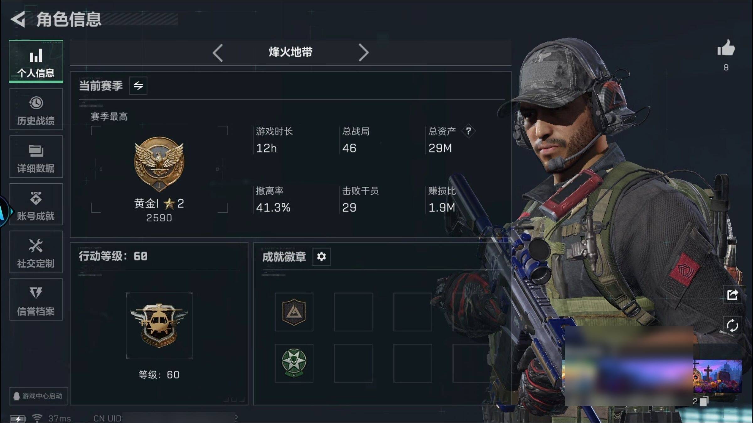 总资产38.3M 3干员外观 21传说枪械 烽火:黑鹰 战场:尉官
