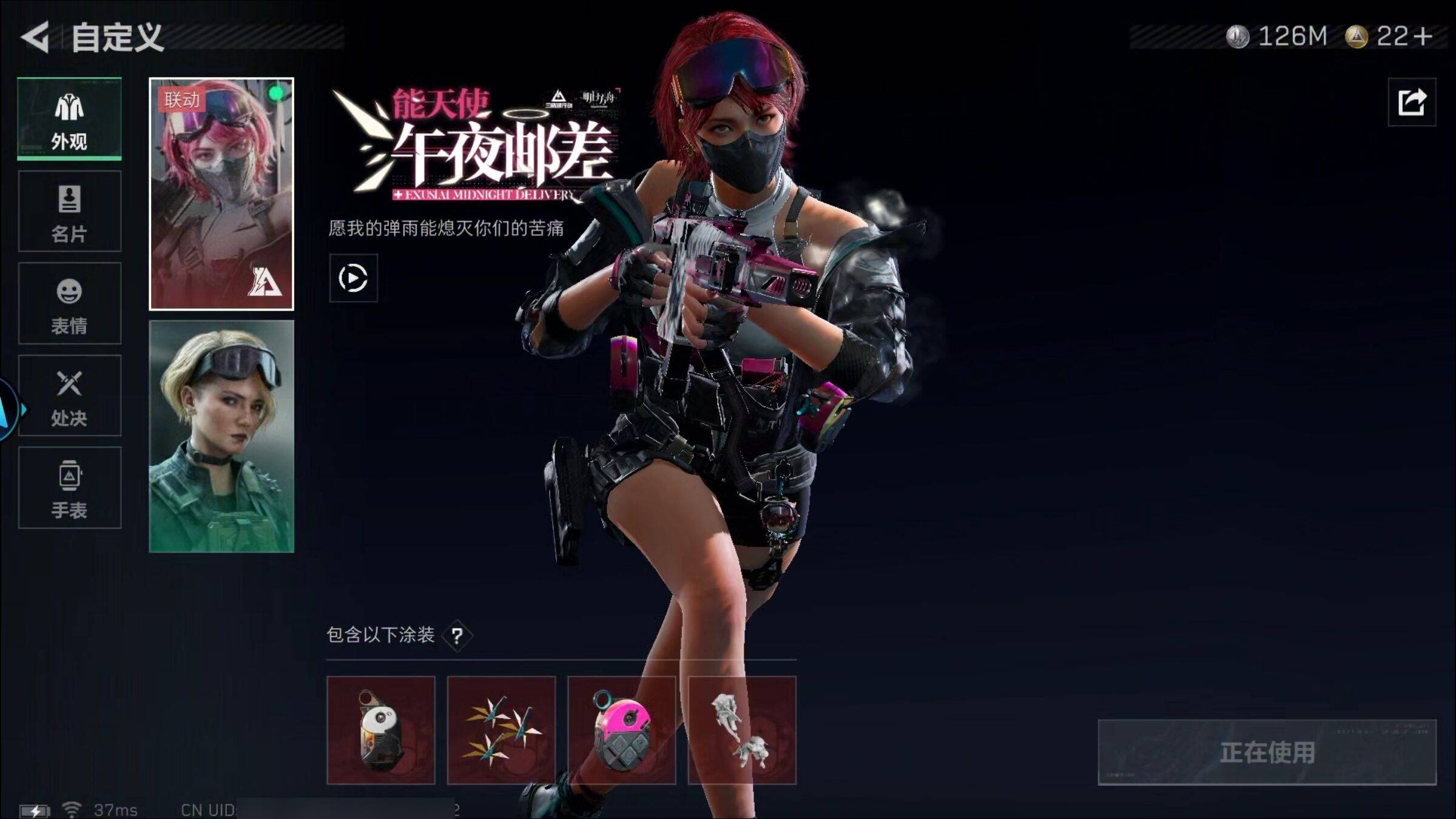 总资产366M 20干员外观 7近战 162传说枪械 烽火:黑鹰 战场:将军 蛊-能天使·午夜邮差露娜-黑·天际线骇爪-水墨云图红狼-蚀金玫瑰骇爪-维什戴尔信条捆绑包电锯惊魂近战捆绑包北极星捆绑包黑海捆绑包