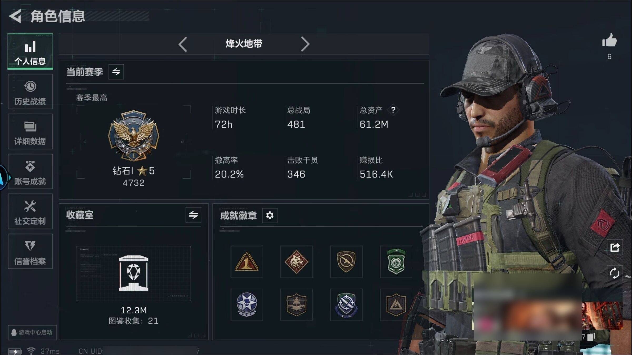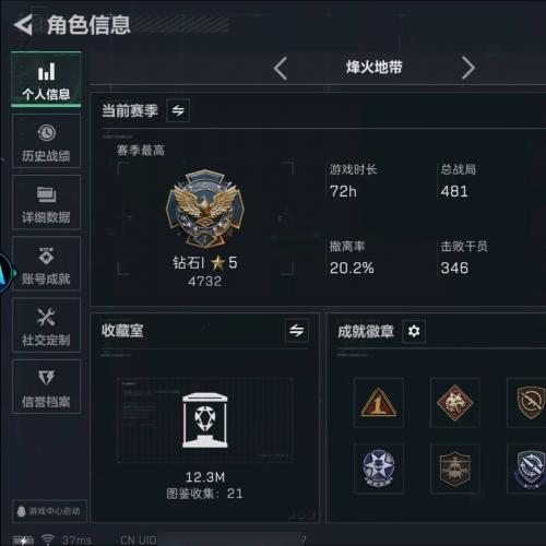 总资产105.2M 4干员外观 16传说枪械 烽火:黄金 战场:无军衔JYM4CRV68