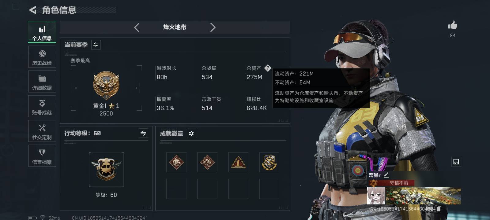 总资产254.6M 4干员外观 9传说枪械 烽火:铂金 战场:列兵JYM255W25