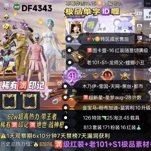 极品单字?喱 ?印记+?红装+老101+S1 【DF4343】?314820‼ ?v 带王者 62w超高热力 稀有满印记 满绝世 双战神框 ?图卡盟 16红装随意切满级 新老101 S1 龙师父 螳螂 小丑 木乃伊 雪国 天网 黑丝 都市 巧克力 金鞋 巡查 追光服 千面 126?45载具171粉装16红装 金宝马 粉布加迪 蓝宾利 10升级 双紫路特斯 迈凯伦 3幻星粉玛莎 金玛红蹦 金蹦 粉飞机 金银兰博 ?超新星m4 星梦aug28计数 ?至情?万古?骑士?仙履 ?玉魂?玉面 精灵 女娲 天蓬 墨龙 盖世 哪吒斯噶 沙丘 金蛇 魔法师 敖丙p90 双华 圣斗士